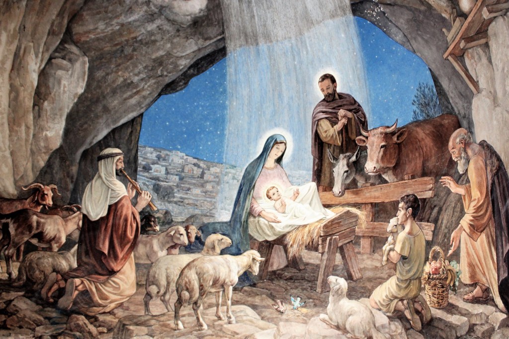 A beautiful artist rendering of the nativity painted on the walls inside the Church of the Nativity